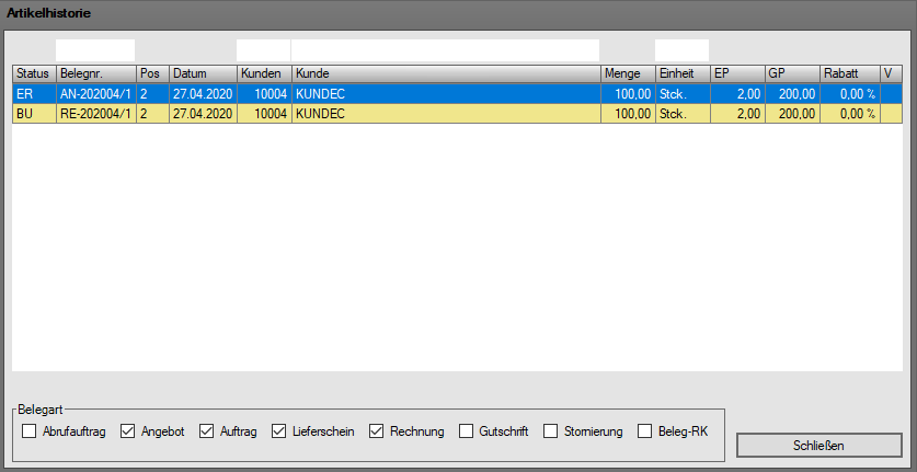 Nach öffnen des "Artikelhistorie"-Dialoges werden in der Listenansicht alle der Auswahl entsprechenden Dokumente angezeigt, in denen der Artikel eingegeben wurden.