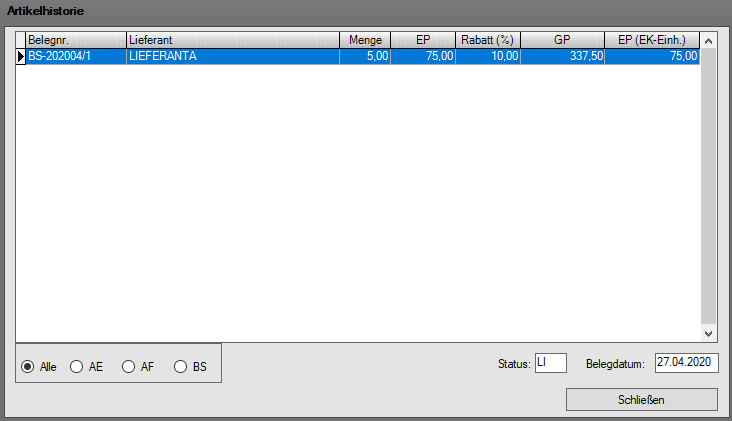 Artikelhistorie-Dialog im Modul Einkauf und Lager¶