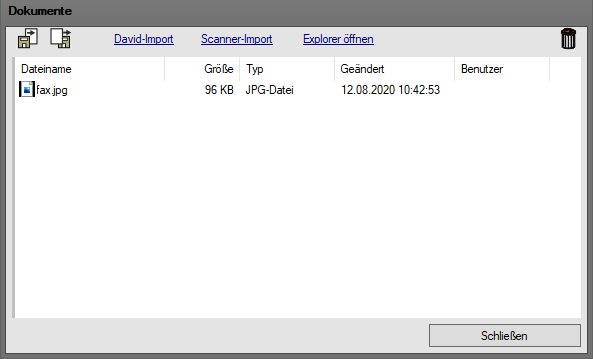 Über den "Dokumente"-Dialog werden Belegen, Artikeln oder auch einem Vorgang, Dokumente angehangen. Diese Dokumente können importiert oder auch exportiert, eingescannt oder über den Windows-Explorer hinzugefügt werden.