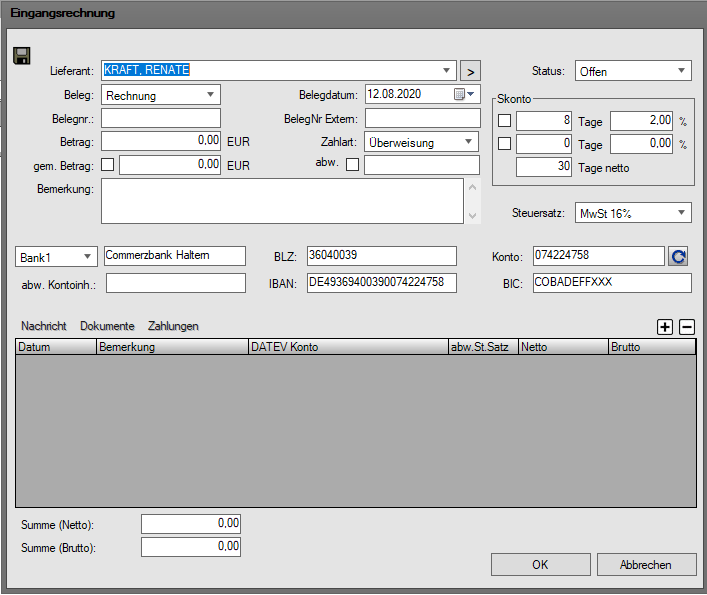 Der "Eingangsrechnung"-Dialog zeigt alle eingegebenen Informationen über eingegangene Rechnungen von einem Lieferanten.