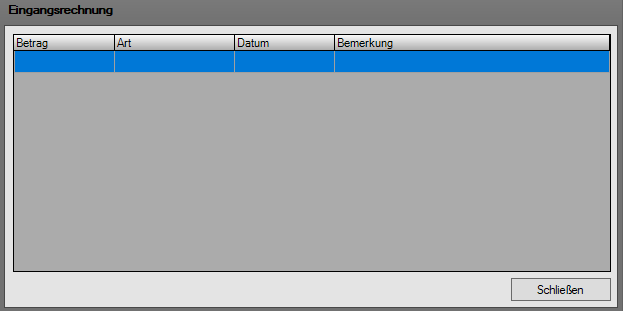 wird ein "Eingangsrechnung"-Dialog geöffnet. In diesem Fenster werden bereits getätigte Zahlungen zu der ausgewählten Eingangsrechnung aufgeführt.