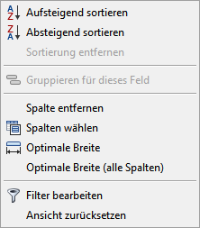 Durch Rechtsklick auf die Spaltenbezeichnung wird ein Popup-Fenster geöffnet.