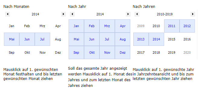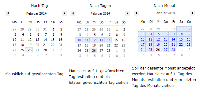 - Über die Pfeiltasten links und rechts der Monatsanzeige wird die Anzeige einen Monat zurück oder vor gestellt