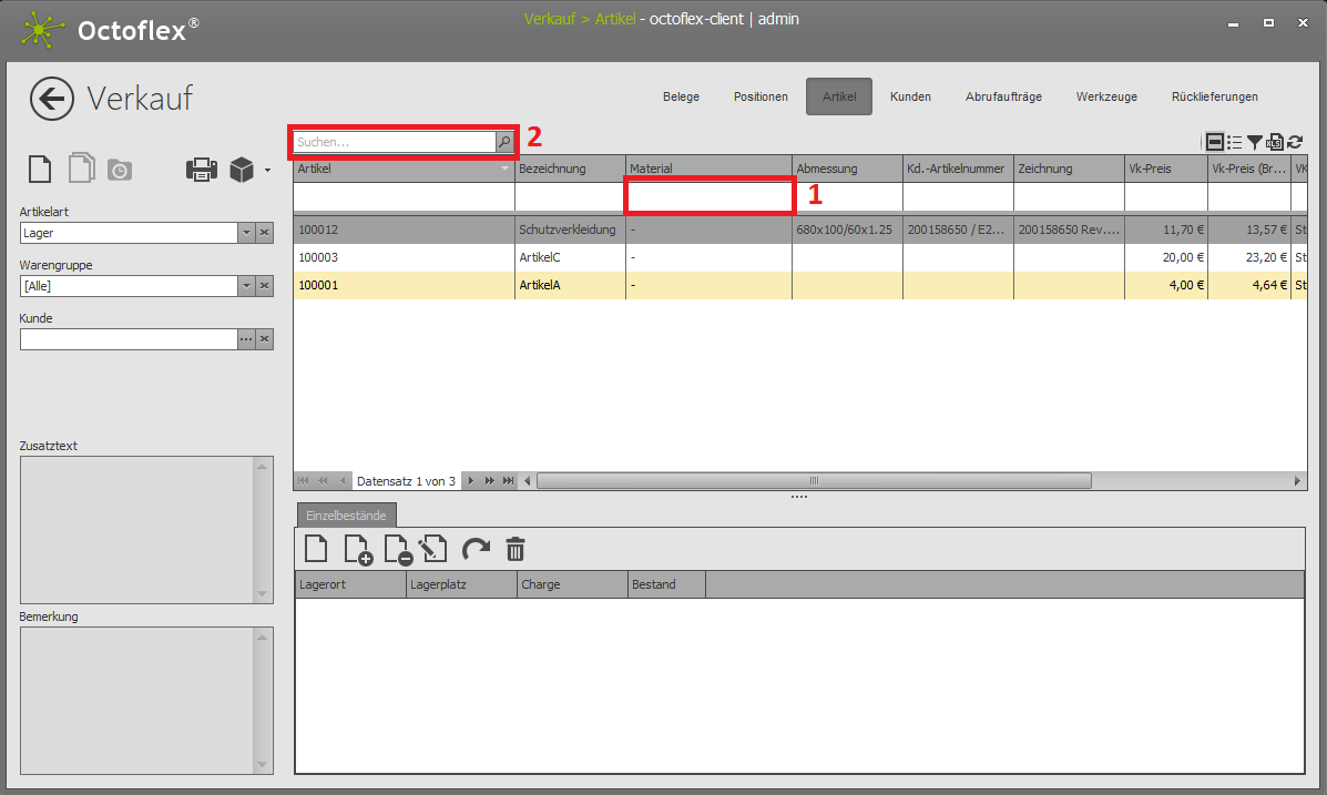 Im Octoflex ERP-Client gibt es verschiedene Möglichkeiten die Ansicht zu filtern. Die "Inkrementelle Spaltensuche", "Volltextsuche", "Spaltenfilter" und "Feste Filter".