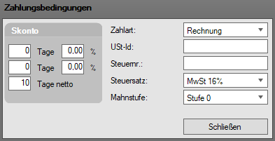 In diesem Bereich können die Tage und der Skonto, der als Zahlungsbedingungen gedacht sind eingetragen werden. Dazu den angezeigten Wert markieren und überschreiben.