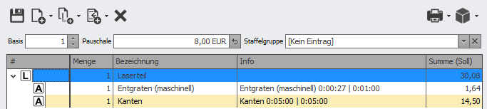 Über die Beschreibung des einzelnen Fertigungsschritt wird jeder Position eine Bezeichnung gegeben. Darüberhinaus werden die Sollzeiten des Arbeitsschrittes hinter der Bezeichnung in Klammern angezeigt.
