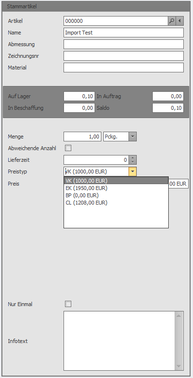 Eine im Artikelstamm hinterlegtes Material wird in dieses Textfeld übernommen.