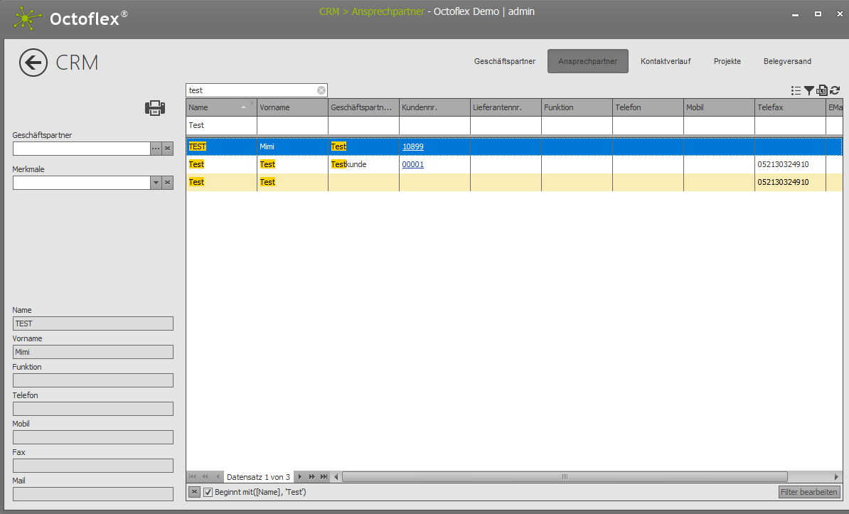 Im Gegensatz zu den meisten Übersichtsmasken im Octoflex-ERP Client sind die Spaltenfilter hier WildCard-Filter. Dies bedeutet, dass die eingegebenen Zeichen im gesamten Spaltentext gesucht werden.