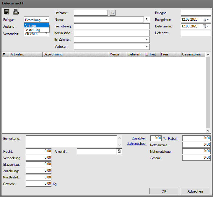 Hier werden alle für den Einkauf relevanten Belegarten angezeigt. Wurde die Belegansicht aus der Listenansicht geöffnet wird die ausgewählte Belegart hier angezeigt. Bei Anlegen eines neuen Beleges ist das Drop-Down-Menü bereits geöffnet. Ansonsten wird dieses mit Klick auf das "Auswahl"-Menü geöffnet. Über Tastatur Pfeiltasten und "Enter" oder Mausklick wird die gewünschte Belegart ausgewählt.