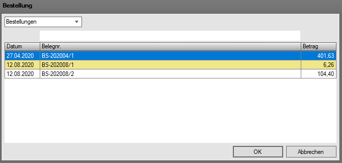 Durch Klick auf "Bestellung" wird der "Bestellungen"-Dialog geöffnet.