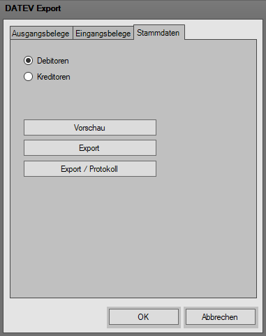 Über das Register "Stammdaten" wird der Datev-Export für Kunden- und Lieferantenstammdaten durchgeführt.