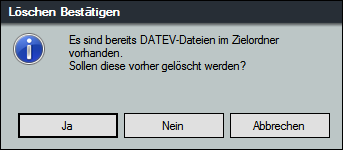 Befinden sich im Zielordner noch DATEV-Dateien von vorangegangenen Exporten öffnet sich der "Löschen Bestätigen"-Dialog.