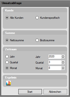 Unter "Ergebnis" wird der nach den eingegebenen Kriterien erzielte Gesamtumsatz angezeigt.