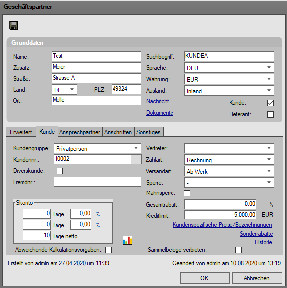 - Es kann nach dem Kunden gesucht werden, Auswertungen vorgenommen und alle Zusatzdaten wie Anschriften, Ansprechpartner, etc. gepflegt werden, da er tatsächlich einen vollwertigen Geschäftspartnerdatensatz darstellt.