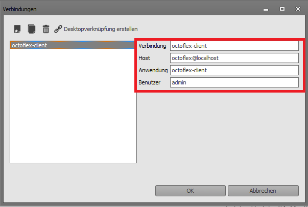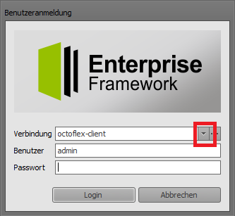 Bei einer Einzelplatz-Installation oder wenn der Octoflex ERP-Client direkt am Server gestartet wird ist in der Regel keine Mehrmandantenfähigkeit konfiguriert ist der Mandant standardmäßig "octoflex". Der Server ist in diesem Fall "localhost".