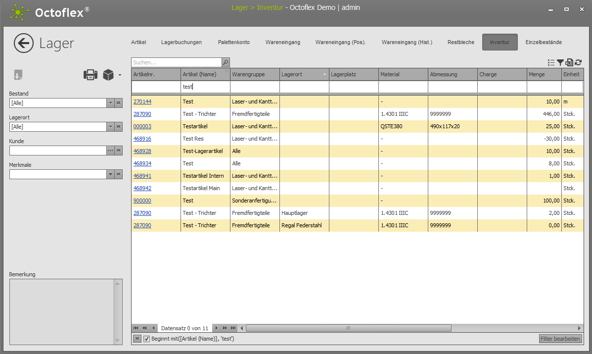 - Markieren der zur Inventur stehenden Artikel. Informationen wie Spalten im Octoflex ERP Client markiert werden können unter Spalten markieren nachgelesen werden.