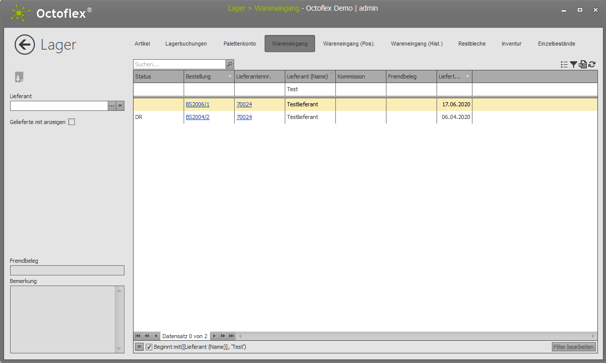 In der Listenansicht des "Wareneingang" werden je nach Einstellung im Filter "Anzeige" alle offenen Bestellungen bzw. Bestellpositionen angezeigt.