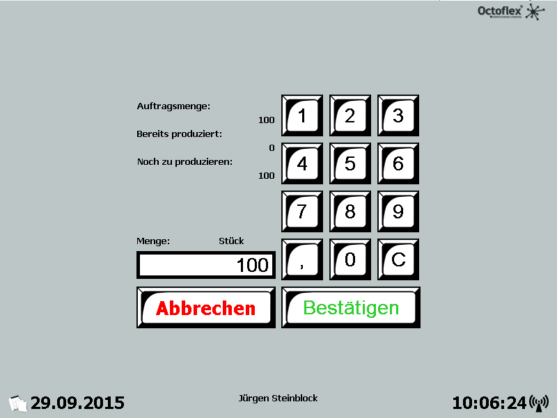 Im Octoflex wird bei dem Arbeitsgang pro Mitarbeiter der zwischen Start und Stop an der an der Maschine angemeldet war (auch mehrfach bzw. nur einen Zeitanzteil, z.B. zum Einrichten), die Zeit zurückgemeldet und für die Gesamtzeit die Zeit der Maschine zurückgemeldet sowie die gemeldete Menge (Vollmenge, wenn die Abfrage Ist der Arbeitsgang damit vollständig erledigt? mit Ja bestätigt wurde) gebucht.