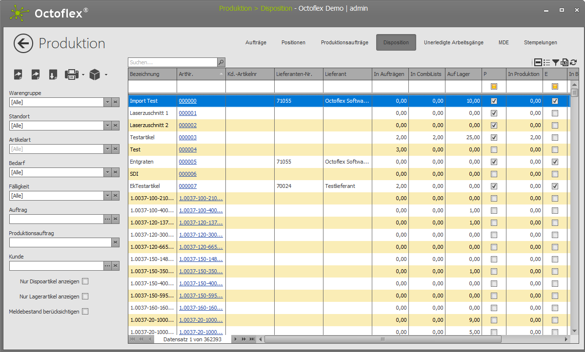 Die "Disposition"-Übersicht in der Produktion zeigt eine speziell auf die Produktion zugeschnittene Sicht auf die Dispositionsartikel. Hier sind Spalten, Filtermöglichkeiten und Funktionen abgebildet, die für die Disposition in der Produktion wichtig sind.