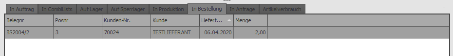 Durch Klicken der einzelnen Register wird die Ansicht der Bedarfsherkunft, (hier "In Aufträgen" und "In CombiList") oder wie z. B. in diesem Beispiel mit "Auf Lager" oder "In Produktion", geändert.