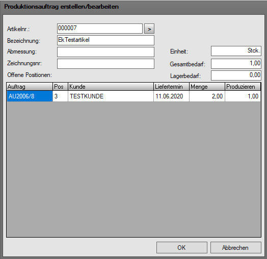 Den Dialog über den Button "OK" verlassen. Die Bedarfsmeldung der Position in der Listenansicht wird um die Eingaben aus dem "Produktionsauftrag"-Dialog geändert.