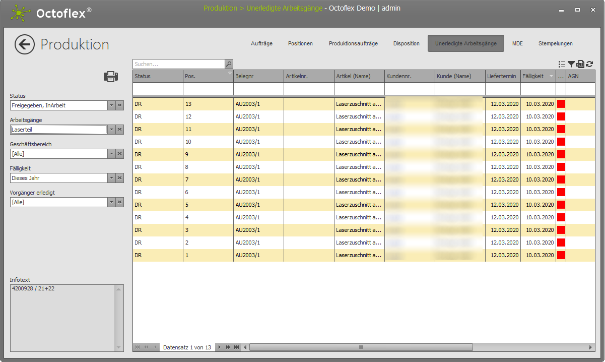 Je nach Filter-Angaben können somit unter Unerledigte Arbeitsgänge drucken alle offenen Arbeitsgängen von eingelasteten Produktionsaufträge nach Datum und Arbeitsgängen sortiert angezeigt und gedruckt werden.