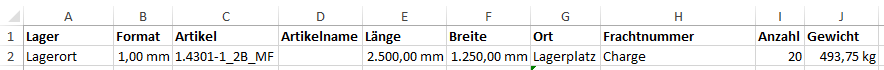 Es wird eine Datei "Plattenbestand*.xls(x)" in dem folgenden Format erwartet. Die Datei dient der Inventur. Bestände in Octoflex werden mit Beständen aus LANTEK überschrieben.