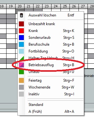 Eine Abwesenheit "Betriebsausflug" (name) mit dem Tastenkürzel Strg+B (shortcut) wird wie ein halber Tag Urlaub (status = 7) gehandhabt. Dabei wird die Arbeitszeit * 0,5 (data = 0.5) gerechnet. Das eindeutige Kennzeichen ist die 16 (statusvalue). In der Oberfläche sieht der Eintrag in rosa/lila (color1 und color2) so aus:
