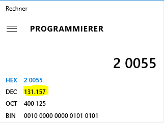 Z.B. Im Windows Taschenrechner Format auf Programmierer umstellen und 20000 + 55 tippen, das Ergebnis ist 20055 bzw. 131157 (Dezimal)
