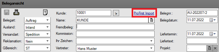 Ist der Pfad zu den PROfirst-Angebot gesetzt, erscheint bei gespeicherten Belegen vom Typ Auftrag ein Link für den Import.