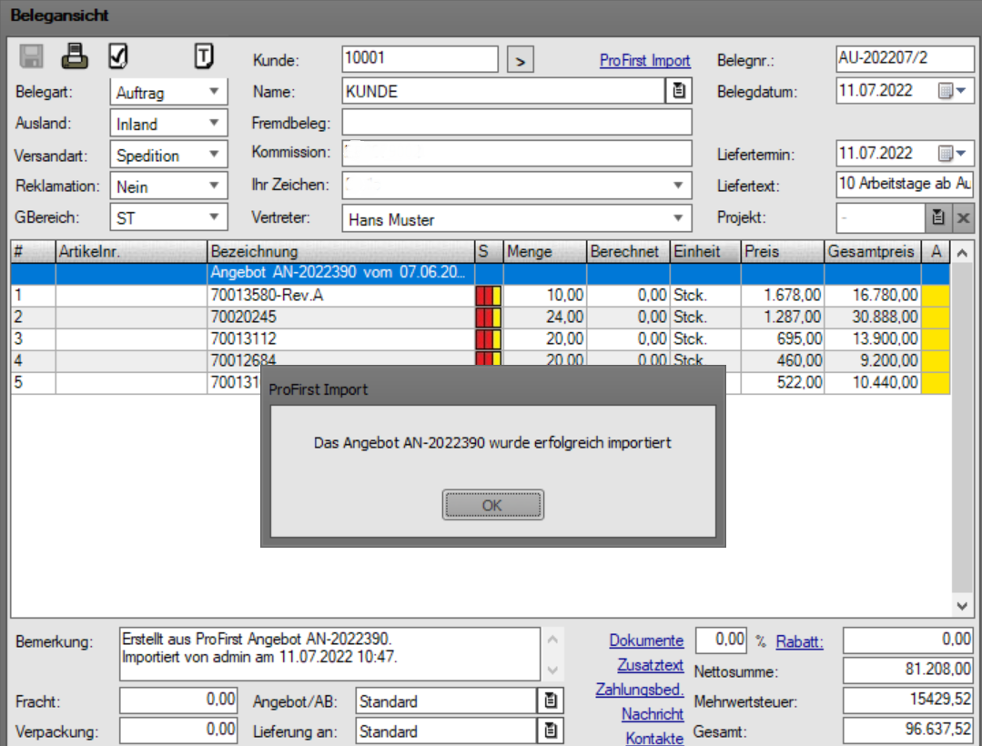 Bei Bestätigung werden die Positionen des Angebots inkl. CombiList importiert, der Kunde wird gesetzt und Felder wie Kommission, Porto, Ihr Zeichen etc übernommen.