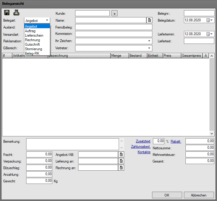 Hier werden alle für den Verkauf relevanten Belegarten angezeigt. Wurde die Belegansicht aus der Listenansicht geöffnet wird die ausgewählte Belegart hier angezeigt.