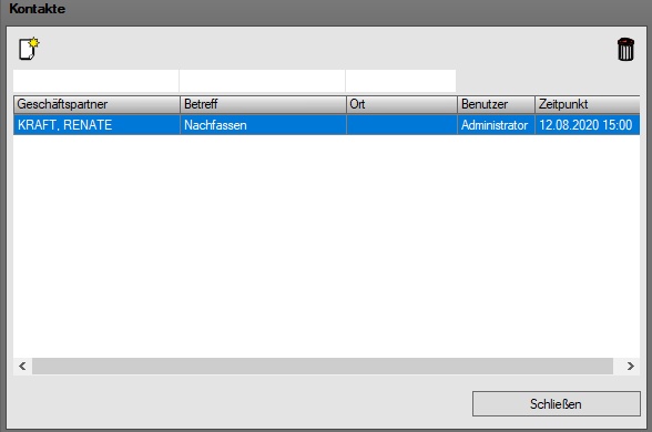 Über das "Neu"-Symbol öffnet sich der "Kontakt"-Dialog über den eine neue Kommunikationsdokumentation dem Beleg hinterlegt werden kann. Dieser Kontakt wird dann im Modul "CRM" in der "Kontaktverlauf"-Übersicht angezeigt.