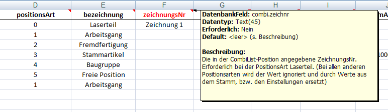 Zu jeder einzelnen Spalte in der Exceltabelle gibt es ein Kommentarfeld mit näheren Erläuterungen welche Daten in das entsprechende Feld gehören, welchen Datentyp diese haben müssen und ob diese eine Pflichtangabe sind oder nicht.