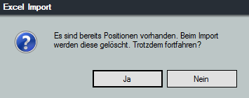 Dabei werden alle Informationen im Beleg mit den Daten aus der Importdatei überschrieben! Auch evtl schon vorhandene Positionen werden nach einer Abfrage gelöscht.