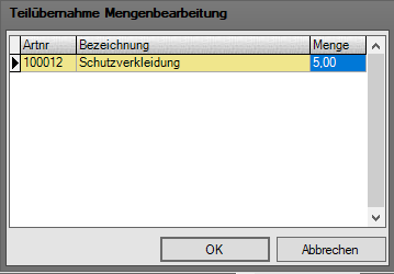 Es öffnet sich der "Teilübernahme Mengenbearbeitung"-Dialog.