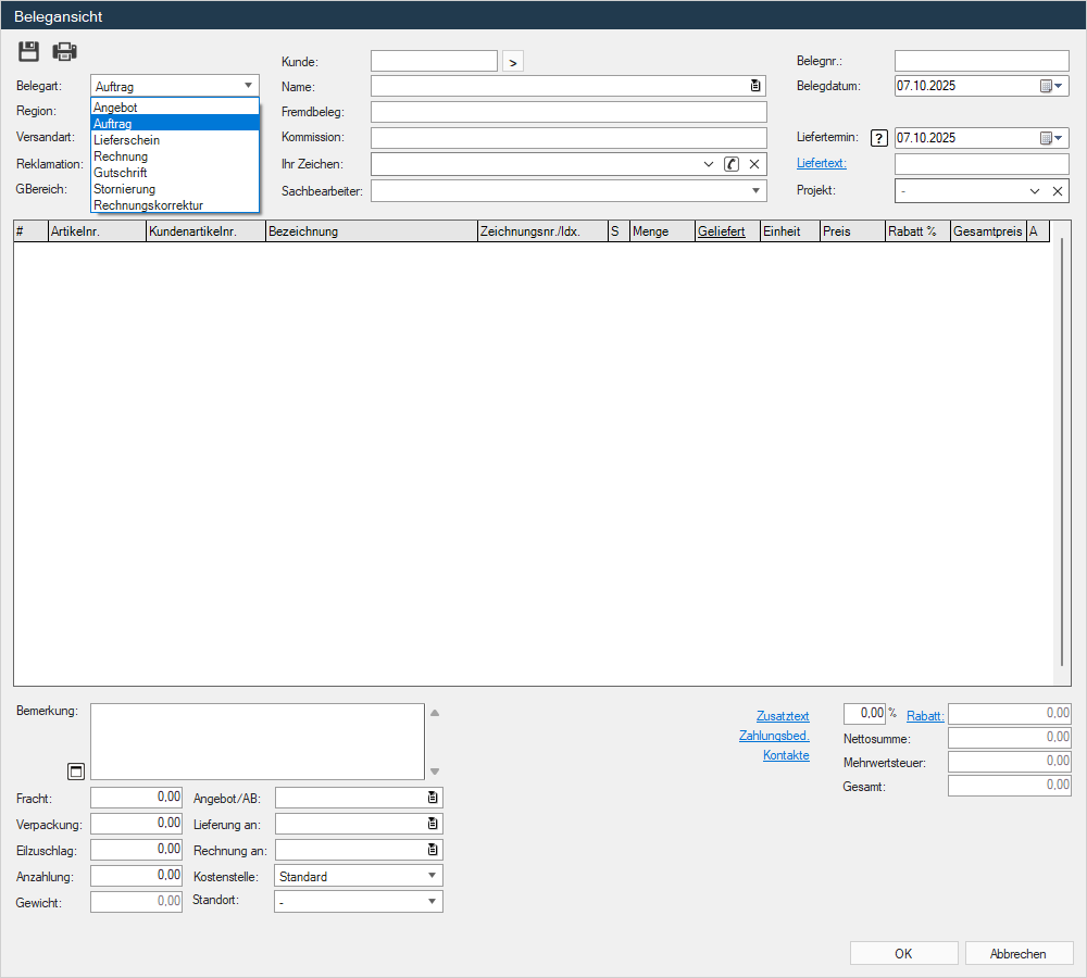 Der "Vertreter", sowie das "Belegdatum" und der "Liefertermin" sind bereits ausgefüllt.